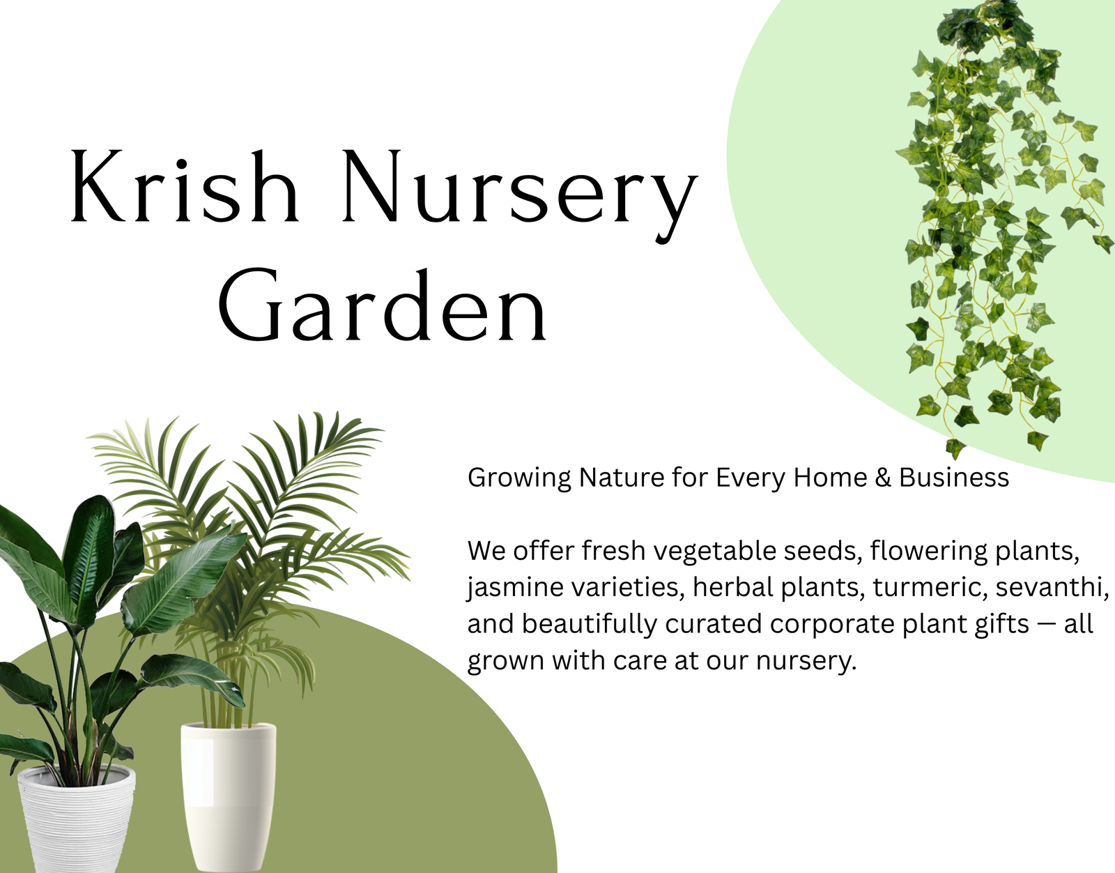 At Krish Nursery Garden, we bring healthy and affordable plants straight from our nursery to your home. We offer vegetable seeds, jasmine and sevanthi flowers, herbal and medicinal plants, turmeric, indoor/outdoor plants, and corporate gifting plants all grown and packed with care. Fresh plants, trusted quality, and fast delivery from our nursery to your doorstep.